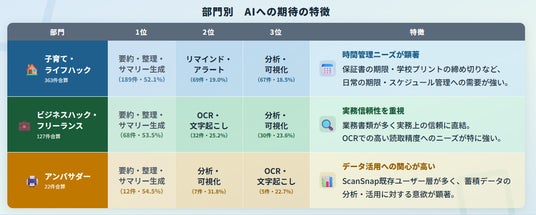 本コンテストには第1期・第2期を合わせて470件のアイデアが寄せられました。部門ごとに課題や扱う紙の種類は異なりましたが、共通した実態が見えてきました。保管場所がわからない、期限を過ぎてから気づくなど、紙の管理に関する課題は、家庭でも職場でも広く共通していました。こうした課題に対して、ユーザーはAIに何を求めたのか。全部門を通じて「AIへの期待」について、分類・集計したところ、第1位は「要約・整理・サマリー生成」で一致しましたが、2位・3位には部門ごとの違いが表れています。ホームシーンが多い子育て・ライフハック部門では、子育てや日常生活では期限のある紙が多く、「リマインド・アラート」へのニーズが高い傾向が見られました。主にビジネスシーンが多いビジネスハック・フリーランス部門では、手間なく正確にデータ化したいという「OCR・文字起こし」への期待が上位に入りました。扱う紙が変われば、AIに求める処理も変わる、という違いが、浮かび上がってきました。
