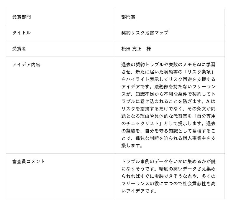 第2期では、日々の生活や業務における具体的な課題を解決するアイデアが多数寄せられました。家庭内の書類や子どものプリントを整理して家事負担を軽減する提案や、フリーランス特有の事務処理をAIで効率化するアイデアなど、ScanSnapとAIを組み合わせた実践的な活用法が集まりました。各部門の専門審査員およびPFUによる審査の結果、日常生活の利便性向上やビジネスにおける生産性向上に貢献する5件を受賞作品として選出しました。