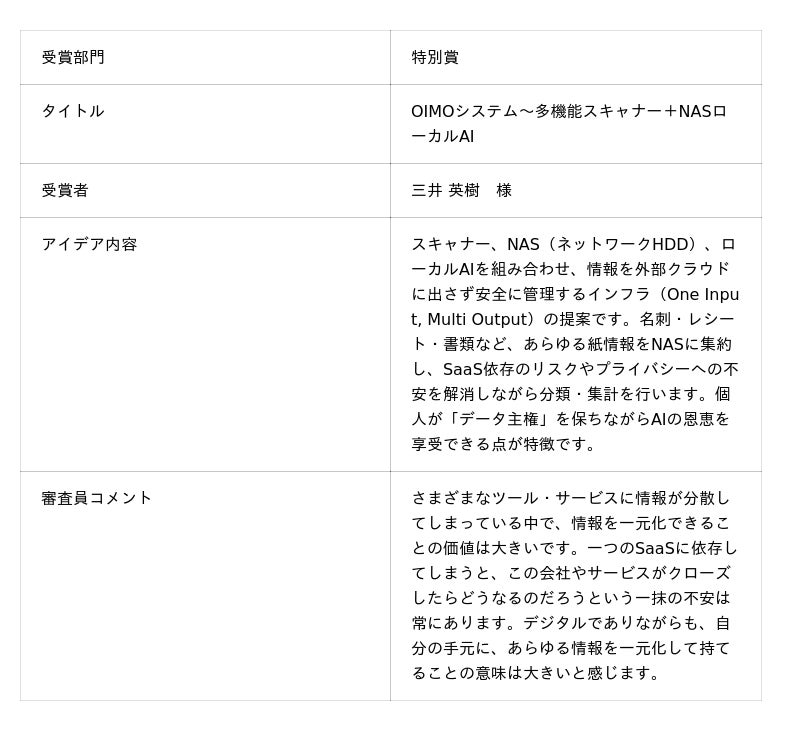 今回のコンテストを通じて、ユーザーが紙×AIに求めているのは「手間なく、正確に、使える状態にする」という体験であることがわかりました。整理・期限通知・正確なデジタル化など、紙の状態のままでは実現できなかったことをAIが担う。そうした活用への期待が、今回の応募アイデアから確認されました。