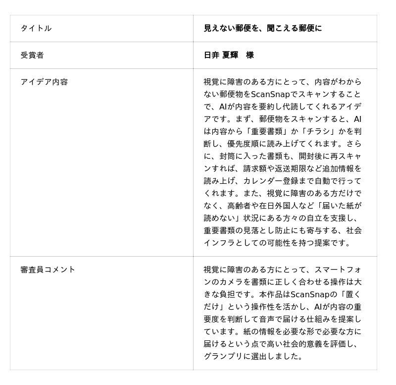 デジタル化が進む今も、学校のプリント、契約書、請求書など、紙の情報は生活や仕事のあちこちに存在しています。ScanSnapでスキャンするだけで、その紙の情報をAIが整理し、通知し、正確にデジタル化する。アナログとデジタルをつなぐことで実現できる体験を、今回寄せられたアイデアは具体的な形で示していました。