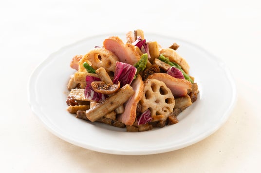 『オリーブ&バルサミコビネガー薫る 合鴨のイタリアンごぼうサラダ』大きめにカットして焼いたごぼうとれんこんに、バルサミコビネガーとオリーブが薫るドレッシングを合わせました。ごぼう特有の土の香りに似た風味と、ケンコーマヨネーズの『オリーブ&バルサミコビネガードレッシング』の酸味と深みのある風味がよく合い、奥行きのある味わいを生み出します。ドライいちじくの甘味がアクセントになっています。しっとり柔らかな合鴨ローストと、ごろごろとした根菜の食感も楽しい一品は、ワインのお供としてもぴったりです。