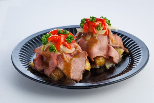 【関西】『直火焼ローストビーフと焼き野菜の甘辛醤油だれ』ジューシーなローストビーフに、グリルしたじゃがいも、たまねぎ、パプリカなどの焼き野菜を合わせ、醤油ベースの甘辛ソースで仕上げました。芳醇な風味のソースがローストビーフとよく合い、休日のごちそうにもぴったりのデリサラダです。ローストビーフをまるでドレスのように盛り付け、見た目も華やかに仕上げました。