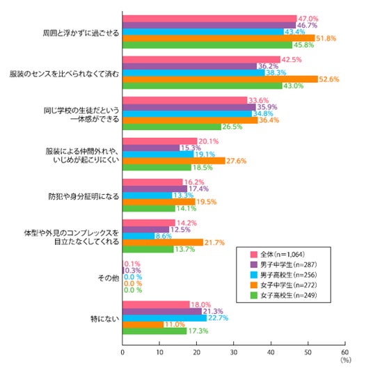 属性別では、女子中学生は「周囲と浮かずに過ごせる」(51.8%)や「服装のセンスを比べられなくて済む」(52.6%)という回答が半数を超えて高くなり、周囲との調和や見た目に関する安心感を重視する傾向が見られます。