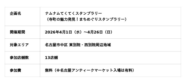 第18回名古屋アンティークマーケット実行委員会は、名古屋市中区の東別院・西別院周辺の寺町エリアを舞台に、地域店舗と連携した回遊型企画「ナムナムてくてくスタンプラリー ~寺町の魅力発見!まちめぐりスタンプラリー~」を実施いたします。