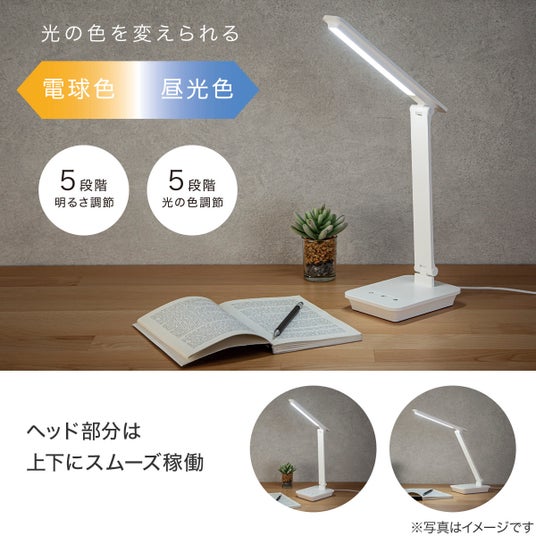 クランプで固定するためスタンド不要で、デスクを広々使えます。アームは2か所が縦横に可動し、光の向きや角度をL字型に調整できるため、手元に影が生まれにくいのが特長。さらに、学習や読書に必要な明るさの目安を定めたJIS基準(JIS Z 9110)を満たす光量を実現。ライト直下では1,500ルクス以上の明るさを確保しながら、机全体でも平均500ルクスの均一な明るさを保つため、教科書・ノート・参考書を広げても、どこも見やすい環境が整います。使わないときはコンパクトに折りたためます。