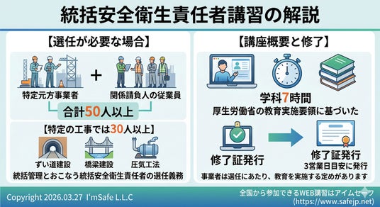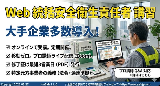 アイムセーフ合同会社では、厚生労働省通達による【統括安全衛生責任者】を社内受講できる便利なオンライン講習会で実施しています。