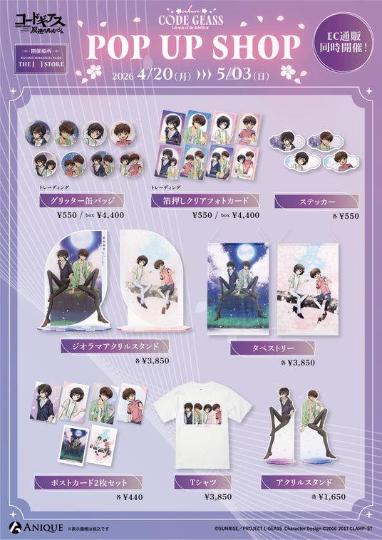 Anique株式会社(本社:東京都千代田区、代表取締役:笠井高秀)は、『コードギアス 反逆のルルーシュ』より、20周年を記念し【さくら】をテーマにした新規描き下ろしイラスト使用のオリジナルグッズを販売いたします。