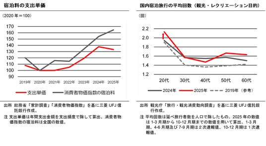 本レポートでは、日本人延べ宿泊者数の減少の背景を、最近の宿泊料上昇の観点から確認した上で、より詳細な旅行目的・年代別の動向についても確認しています。