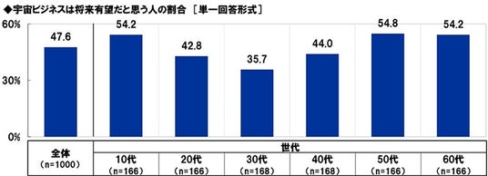 - 「宇宙ビジネスは将来有望だと思う」48%、10代と50代以上では50%超