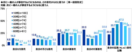 月に一般の人が移住するようになると思う人(453名)に、月に一般の人が移住するようになるのは、どの世代からだと思うかを聞いたところ、20代以上では「自分の玄孫(やしゃご)世代以降」(20代35.7%、30代43.2%、40代47.3%、50代39.4%、60代36.1%)に最も回答が集まりました。他方、10代では「自分の玄孫世代以降」(22.3%)のほか、「自分のひ孫世代」(32.0%)や「自分の孫世代」(25.2%)に回答が分かれました。また、20代では「自分の玄孫世代以降」(35.7%)が最も高いものの、「自分たち世代」(14.3%)が他の世代と比べて高くなりました。