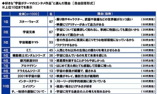 選んだ理由についてみると、1位の『スター・ウォーズ』では「乗り物やキャラクター、武器や装備などの世界観がカッコ良い」や「映像にリアリティーがあって迫力がある」、2位の『宇宙兄弟』では「宇宙について結構詳しく知れるし、単純に物語としても面白いから」や「夢があって面白かった」、3位の『宇宙戦艦ヤマト』では「昔の作品なのに現実に起こりそうな地球環境になっているから」や「ワクワクするから」といった回答が挙げられました。