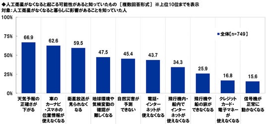 人工衛星がなくなると暮らしに影響があることを知っていた人(749名)に、人工衛星がなくなると起こる可能性があると知っていたものを聞いたところ、「天気予報の正確さが下がる」(66.9%)が最も高くなり、「車のカーナビ・スマホの位置情報が使えなくなる」(62.6%)、「衛星放送が見られなくなる」(59.5%)、「地球環境や気候変動の確認が難しくなる」(47.5%)、「自然災害が予測できない」(45.4%)が続きました。