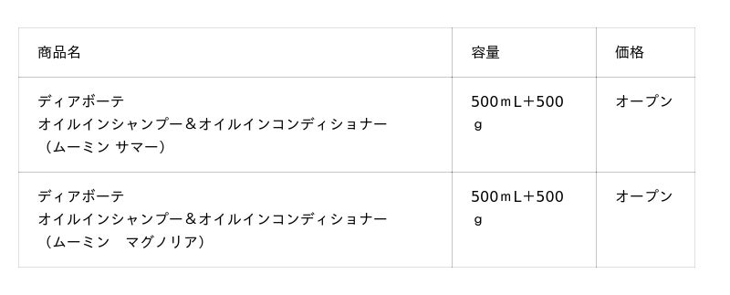 「ディアボーテ HIMAWARI」は、「ムーミン」デザインの限定商品を、毎回テーマ性を持ってお届けしています。今回お届けするのは、初夏のヘアケアの気分を高める「ムーミン サマー」と「ムーミン マグノリア」の2種のシャンプー&コンディショナーです。
