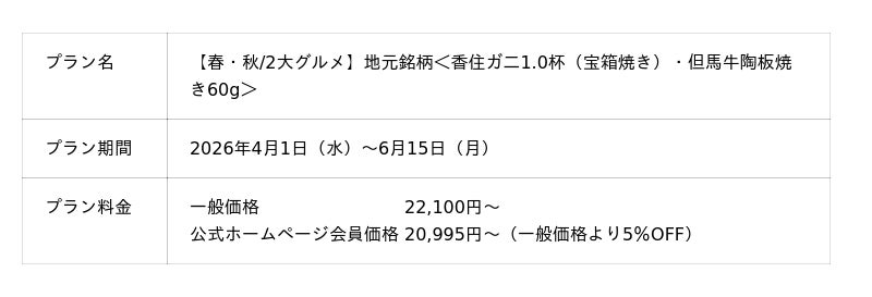 アイアンドエフ・ビルディング株式会社(本社:大阪市北区、代表取締役:泉 邦治)が運営するビナリオホテルズ&リゾーツの施設の1つ「山陰湯村温泉 湧泉(ゆうせん)の宿ゆあむ」(兵庫県)では春の味覚・香住ガニ付プランを【2026年4月1日(水)~6月15日(月)】にご提供いたします。
