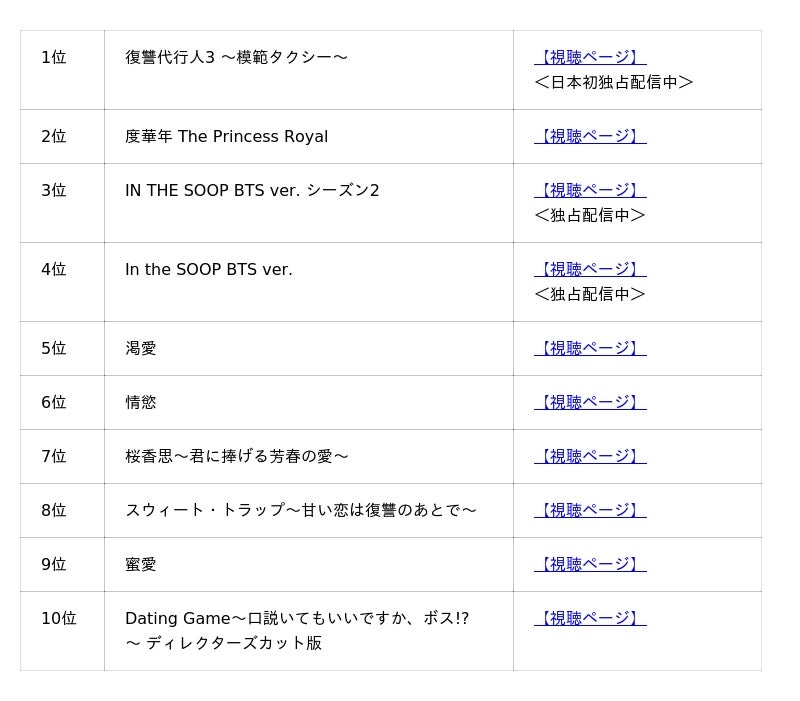 株式会社NTTドコモの映像配信サービス「Lemino(R)」は、2026年2月の韓流・アジアコンテンツの月間視聴数を集計し、「Lemino人気作品月間ランキング」を発表いたします。2月も引き続き、”模範タクシー”に乗る秘密のプロフェッショナル集団が弱者に代わって法では裁けない悪に復讐するアクションエンターテインメント『復讐代行人3 ~模範タクシー~』が首位を獲得し、これで4ヶ月連続の1位となりました。