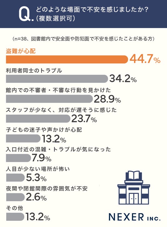 次いで「利用者同士のトラブル」が34.2%、「館内での不審者・不審な行動を見かけた」が28.9%と続きます。