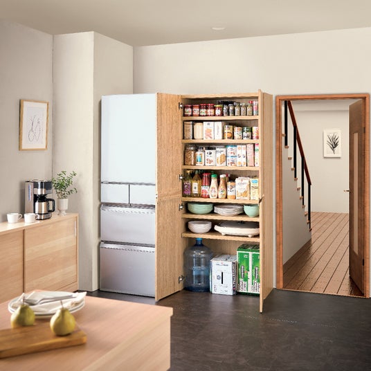 サイズは奥行39.4cm×高さ180cmで、幅は60cmと80cmの2サイズを用意。各家庭のインテリアに調和しやすいよう、色はホワイトとナチュラルオークの2色をそれぞれラインアップしました。キッチンのパントリーとしての使用はもちろん、玄関や洗面所、リビング、寝室などあらゆるシーンでの使用を想定しています。