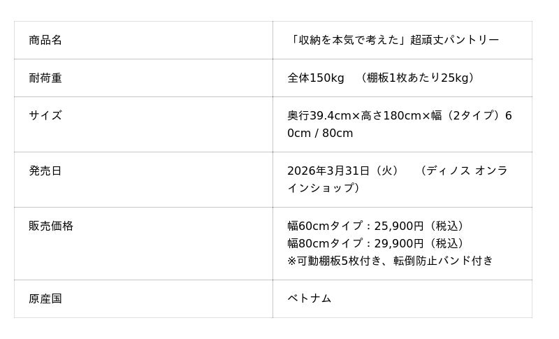 株式会社dinos(本社:東京都中野区、代表取締役社長:加藤 浩輔)は、総耐荷重150kgで大容量の収納力を備えた収納棚「『収納を本気で考えた』超頑丈パントリー」を企画・開発し、2026年3月31日より『ディノス オンラインショップ』で発売します。また、4月1日には本商品を掲載したカタログ『dinos LIVING』2026年夏号を発刊し配布を開始いたします。