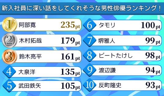 今回の調査では「新入社員に向けて、これからの社会人生活の参考になる深い話をしてくれそう」と思われている男性の俳優は誰なのかを調査。