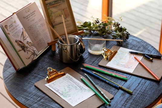 「森の絵葉書づくり」では、初夏の森が見せる鮮やかな緑のグラデーションや流れる雲などの自然の移ろいを見つけ、絵や言葉で表現できます。グランピングリュックにあらかじめ用意された色鉛筆と絵葉書を使い、キャビンやクラウドテラスなどお気に入りの場所で創作するひとときを過ごせます。大切な人や自分に向けて、旅の思い出を描き残す体験です。