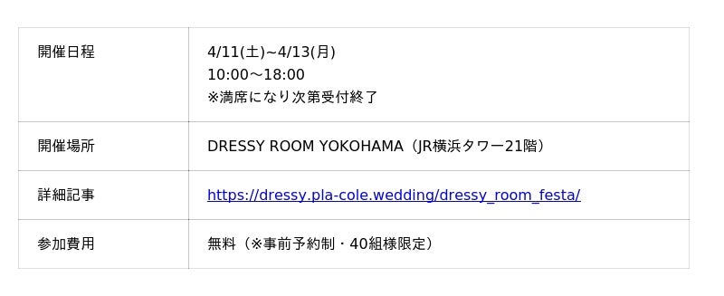 「PLACOLE & DRESSY」ブランドを展開する冒険社プラコレ(本社:神奈川県鎌倉市、代表取締役CEO:武藤功樹)は、横浜駅直結JR横浜タワー21F、ウェディングの魔法にかかる空間"DRESSY ROOM YOKOHAMA"にて、4/11(土)~4/13(月)の3日間限定で、これから結婚式をお考えのカップル様に向けた、個室相談やウェディングドレス試着ができる豪華特典付きのウェディング初体験フェスを開催いたします。(40組様限定、無料開催)