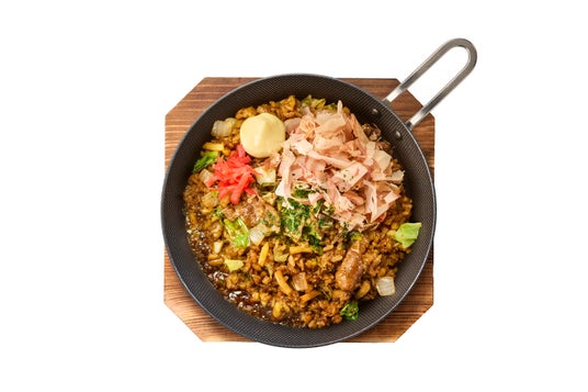 目の前で熱々のグリルパンで調理され、そのまま提供される、作り手と食べ手の境界線があいまいになるほどのできたて感、視覚を奪うほどの立ちのぼる湯気、聴覚を刺激する焼ける音、嗅覚を支配するソースの香り、味覚を虜にする圧倒的破壊力のある味わい。五感を刺激するうどんと飯の“禁断のタッグ”を、欲望の赴くままに夢中で喰らいついてください。