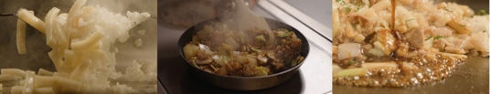 もちもち食感のうどんにやみつきの特製ソースを絡めて焼き上げました。いつもとひと味違うコク深い味わいと香ばしさ。豚肉やキャベツなどの具材とともに、食べ応えある一皿!