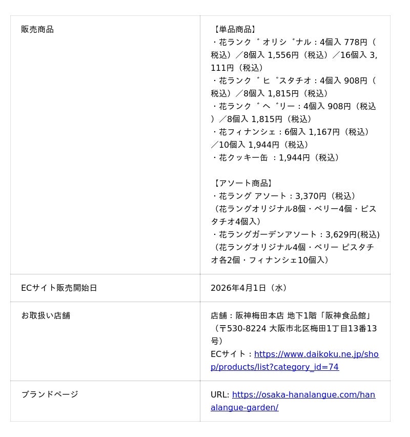 1805年(文化2年)創業の大阪銘菓“おこし”の老舗である、株式会社あみだ池大黒(本店所在地:大阪市西区/代表取締役社長:小林昌平)は、シリーズ累計販売個数2,000万個を突破した人気土産「花ラング」の専門店として昨年オープンした「花ラングガーデン」(阪神梅田本店にて展開)の商品を、2026年4月1日(水)より、あみだ池大黒公式ECサイトで販売開始いたします。※本ECサイトの公開は、4月1日(水)からを予定しております。