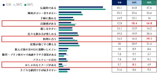 本格焼酎・泡盛のイメージとしては、「伝統的」が45.1%で最多となりました。また、「風味がよい・香りがよい」といった嗜好性も評価されています。20~30代では、「高級感がある」「おしゃれ」「料理に合う」といったイメージが全体平均を上回っています。