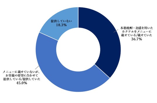 本格焼酎・泡盛を現在提供している店舗は全体の8割を占め、提供経験のある店舗は約9割に上ります。また、本格焼酎・泡盛を用いたカクテルを提供した経験がある店舗が81.7%で、そのうち「メニューに載せていない」店舗が45.0%でした。Q.本格焼酎・泡盛の提供状況(N=67)