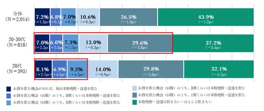 20-30代のお酒を飲む機会に本格焼酎・泡盛を日常的に飲むと回答した層が62.8%となり、全体傾向と比較して高い結果となりました。なかでも20代では、「5割以上」飲むと回答した層が24.2%と前回調査から増加しており、若年層における本格焼酎・泡盛の飲用機会の拡大がうかがえます。Q.お酒を飲む機会(回数)のうち、本格焼酎・泡盛を飲む機会(回数)の割合