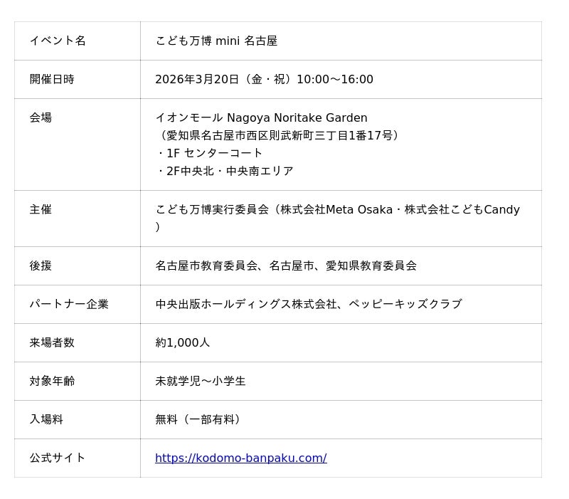 こども万博実行委員会(株式会社Meta Osaka、株式会社こどもCandy)は、2026年3月20日(金・祝)、イオンモール Nagoya Noritake Garden(名古屋市西区)にて、子どもたちの夢を応援するイベント「こども万博 mini 名古屋」を開催しました。名古屋初開催となる本イベントには約1,000名が来場。おしごと体験に参加した子どもの94%が「また体験したい」と回答し、保護者の60%が「子どもの変化を感じた」と答えるなど、体験を通じた子どもの主体性・自己肯定感の向上に手応えを得ました。
