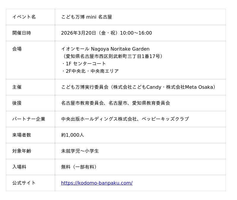 こども万博実行委員会(株式会社こどもCandy、株式会社Meta Osaka)は、2026年3月20日(金・祝)、イオンモール Nagoya Noritake Garden(名古屋市西区)にて、子どもたちの夢を応援するイベント「こども万博 mini 名古屋」を開催しました。名古屋初開催となる本イベントには約1,000名が来場。おしごと体験に参加した子どもの94%が「また体験したい」と回答し、保護者の60%が「子どもの変化を感じた」と答えるなど、体験を通じた子どもの主体性・自己肯定感の向上に手応えを得ました。