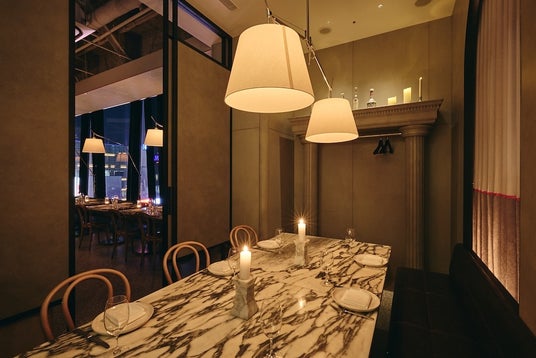 大理石調のテーブルや神殿を想起させる柱頭装飾、シアーカーテン越しに差し込む柔らかな光が、洗練された非日常空間を演出。接待や記念日など、特別なシーンにおすすめです。