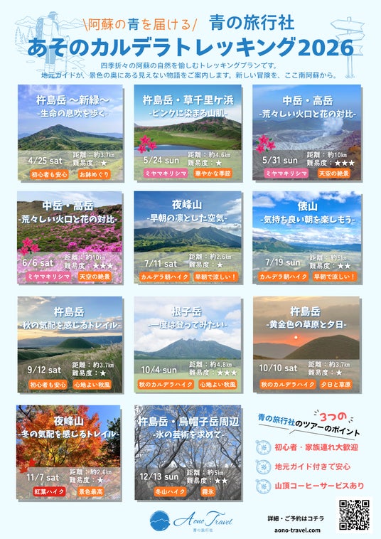 「阿蘇のカルデラトレッキング~2026シーズン~」を開催します 。新緑から霧氷まで全11回の多彩なプログラムを用意 。ガイド付で初心者や家族連れも安心の特別な山歩き体験です
