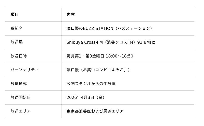 株式会社BUZZ GROUP(本社:東京都港区、代表取締役:渡辺 憲)は、2026年4月3日(金)より、Shibuya Cross-FM(93.8MHz)にて新ラジオ番組「濱口優のBUZZ STATION(バズステーション)」の放送を開始することをお知らせします。