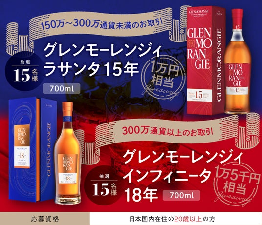 キャンペーン期間中、ポンド/円(GBP/JPY)にて新規約定150万通貨以上のお取引をいただいたお客さまの中から抽選で総勢30名様に、取引数量に応じて、イギリスゆかりのシングルモルト「グレンモーレンジィ」をプレゼントいたします。