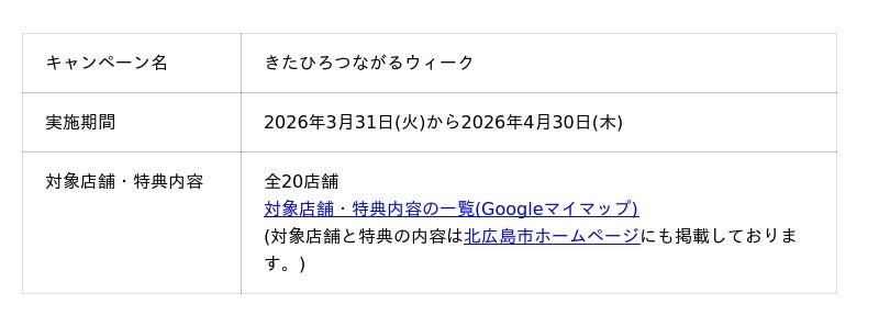 「北海道ボールパークFビレッジ」のあるまち・北海道北広島市で、2026年3月31日(火)から「きたひろつながるウィーク」を開始いたします。このキャンペーンは野球の開幕戦に合わせて北広島市内にある店舗をより多くのお客様にご利用いただくためのもので、4月30日(木)までの期間限定で店舗ごとに様々な特典をご用意しております。
