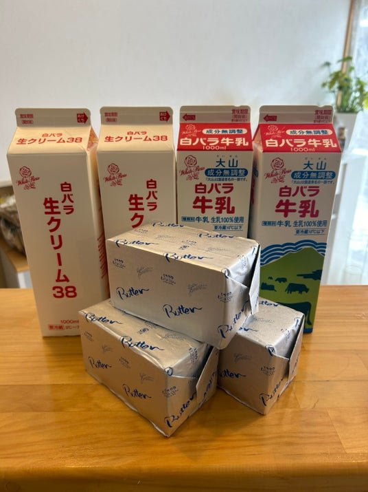 大山乳業の牛乳、生クリーム、バター、アイスを使用している