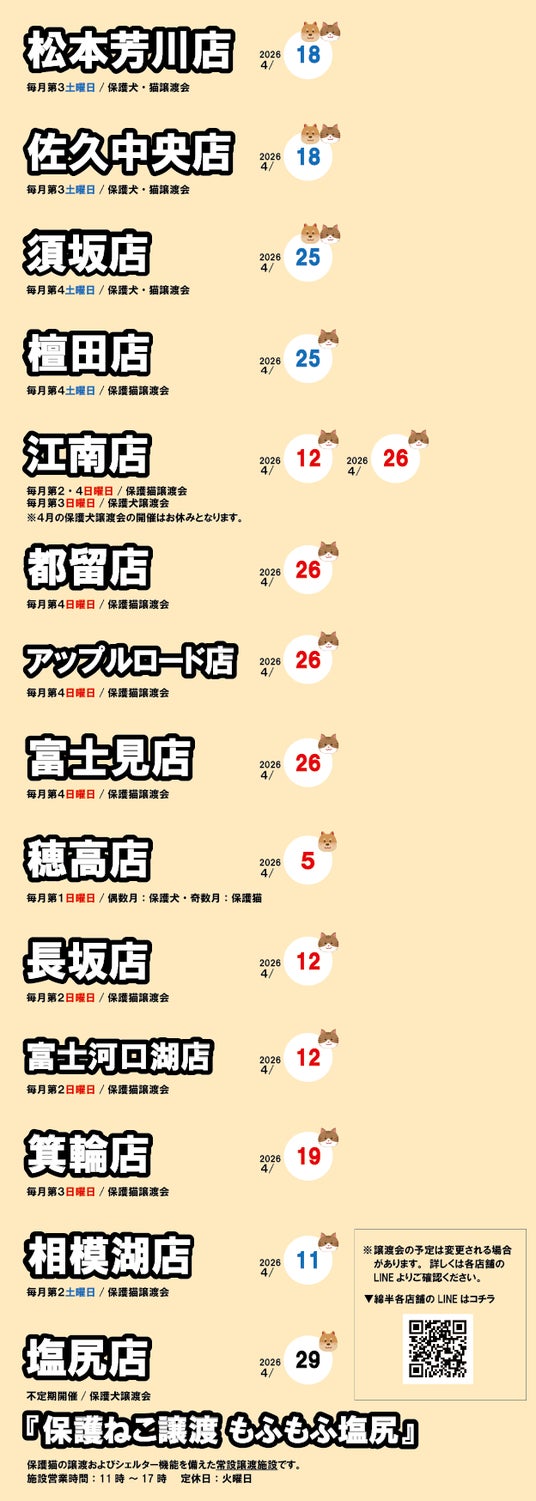 綿半パートナーズ株式会社(長野県飯田市 代表取締役社長:野原佳代子)はこの度、長野・山梨・愛知・神奈川の綿半店舗にて保護犬・保護猫の譲渡会を実施します。