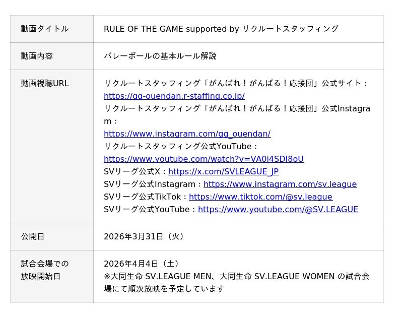 株式会社リクルートスタッフィング(本社:東京都千代田区、代表取締役社長:田中 智己、以下「リクルートスタッフィング」)は、公益社団法人SVリーグ(本社:東京都千代田区、代表理事:大河 正明、以下SVリーグ)が制作する動画「RULE OF THE GAME supported by リクルートスタッフィング」にパートナーとして協賛しましたので、お知らせいたします。