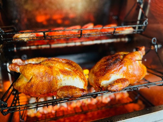 ロティサリーオーブン(回転ロースター)で焼かれた鶏は余分な脂を落としながら、また下で脂を受けることで脂の旨味が凝縮され、シンプルな味付けながら味わい深く焼き上がります。