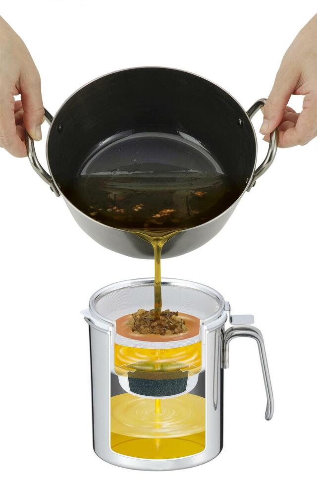 揚げ物のあとは、「ステンレス製カートリッジ式オイルポット 0.6L」で油を濾して有効活用。しっかり濾過すればまた使えるから節約にもなります。