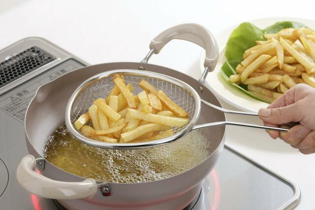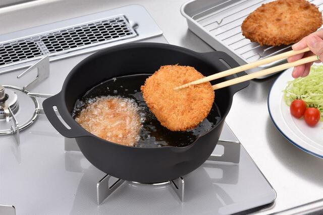 例えばコロッケを揚げるなら、コロッケの二回りほど大きいサイズ感で、少ない油でも無駄なく効率的に揚げられるのです。まさにお弁当づくりや1〜2人分の調理に最適。