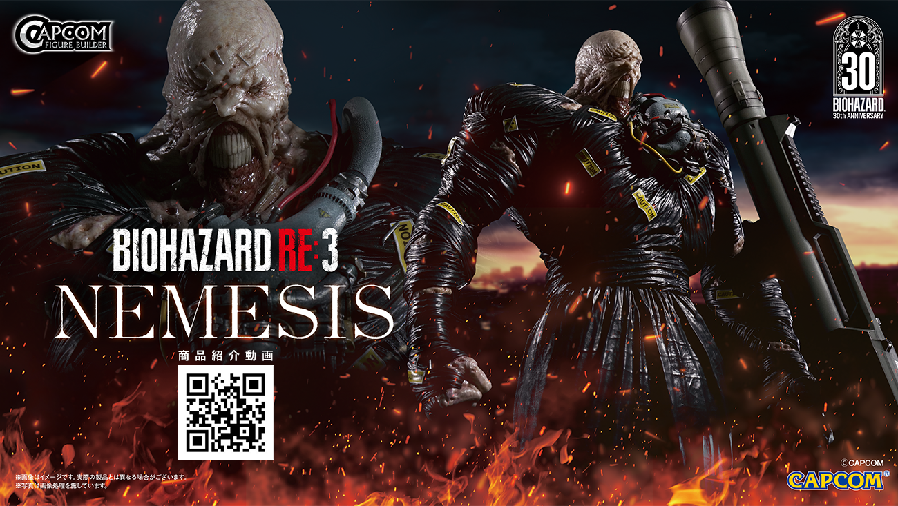 「バイオハザード」30周年を記念して『バイオハザード RE:3』より「ネメシス」が1/6スケールで登場! 両腕の交換オプションとネメシス輸送筐体のデザインをあしらった台座、さらに30周年を記念して原作のネメシス頭部へ交換可能なパーツも付属した豪華セット。特徴的な口元と心臓を模した制御装置は精密な造形と塗装存在感ある仕上がりに。全高約43cmに及ぶ力強いシルエットにはクリエイターたちの技巧が凝縮されています。ぜひご予約を!