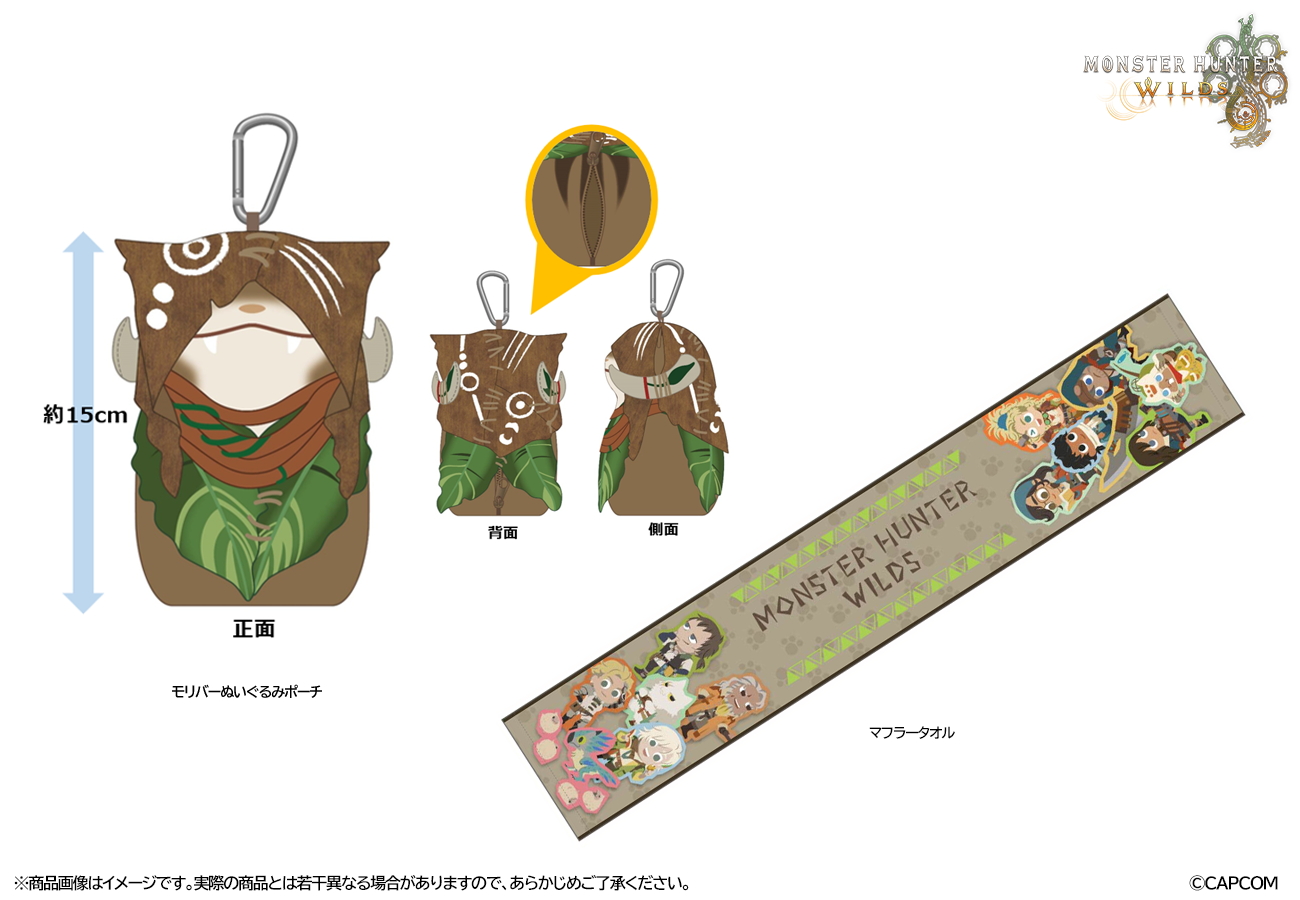 『モンスターハンターワイルズ』に登場するキャラクターをかわいくデフォルメしたデザイン「キュートでふぉ」のマフラータオルと、「モリバー」のぬいぐるみポーチを予約中! かわいらしい商品をぜひお求めください!