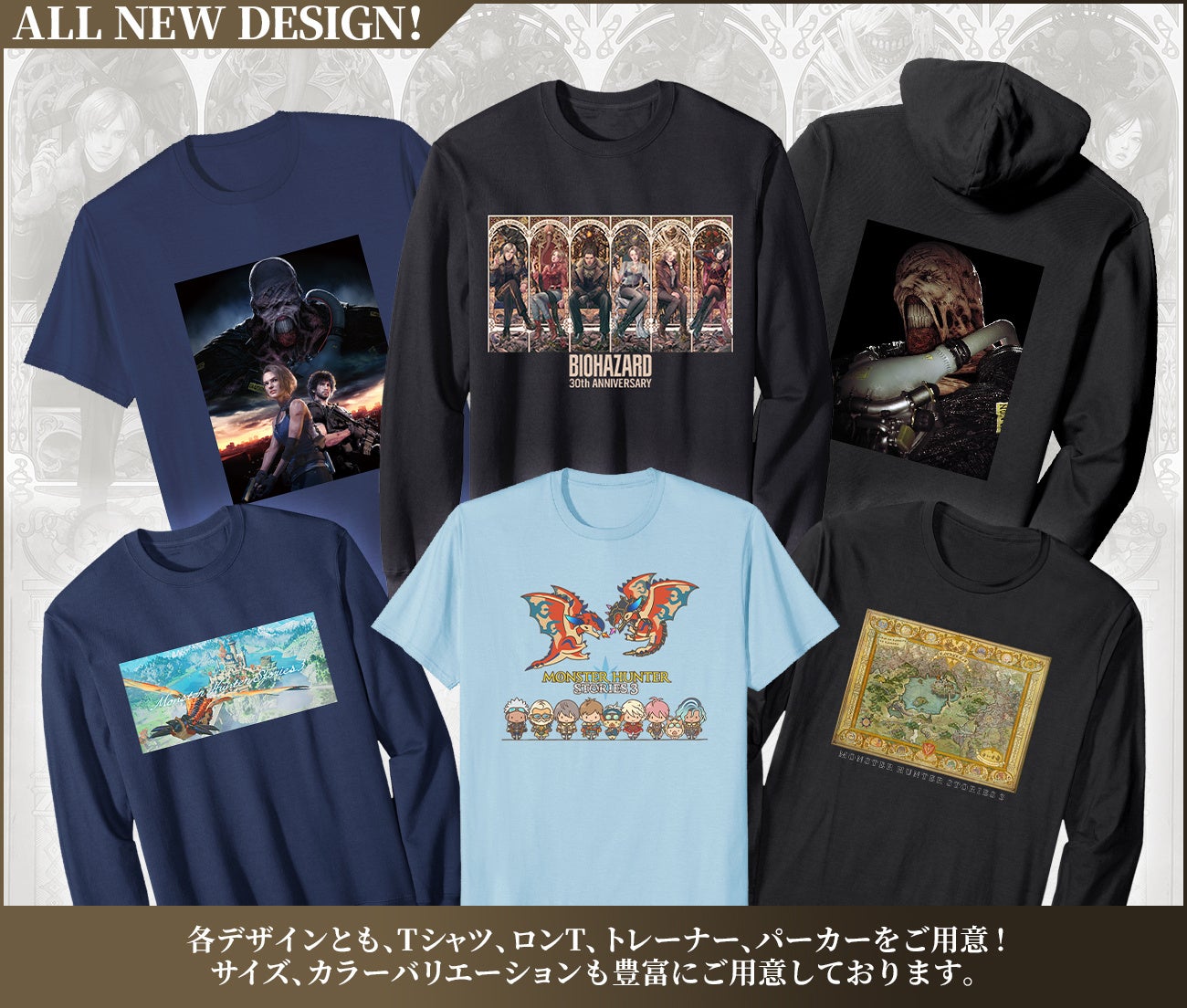 「バイオハザード」シリーズからは30周年記念アートデザインのほか、1/6フィギュア発表で話題のネメシスデザインと「RE:3」のメインアートデザインが登場。また、ついに発売となった『モンスターハンターストーリーズ3 ~運命の双竜~』からは新規描き下ろしのデフォルメアートスタイルや、アズラルをテーマに周辺地図と上空を舞うレウスのデザインが登場! 半袖Tシャツはもちろん、ロンT、トレーナー、パーカーのお好きなタイプからお選びいただける他、前面プリントと背面プリントをお選びいただけます。今すぐチェック!