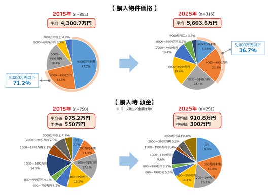 - 〈購入物件価格〉過去10年間の物件購入平均価格は約1,360万円増加- 〈購入時頭金〉購入時の頭金は過去10年間で250万円減少(中央値)