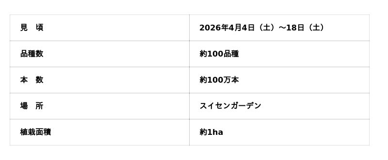 期間中は、花の観賞とあわせて楽しめるイベントや春限定グルメ・お土産品など、盛りだくさんの内容となっています。本格的な春の行楽シーズンに、季節の移ろいを感じながら、友達や家族と一緒に思い出に残るひと時をお過ごしください。
