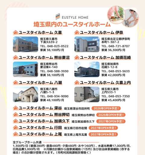 また、今後埼玉県内では、ユースタイルホームは深谷・熊谷押切・加須久下・行田・上尾の新規開設を予定しています。重度障害・難病ケアの専門事業者として、「自宅生活・共同生活・日中活動」の三本柱で、埼玉県内の重度障害者の地域生活をトータルサポートいたします。